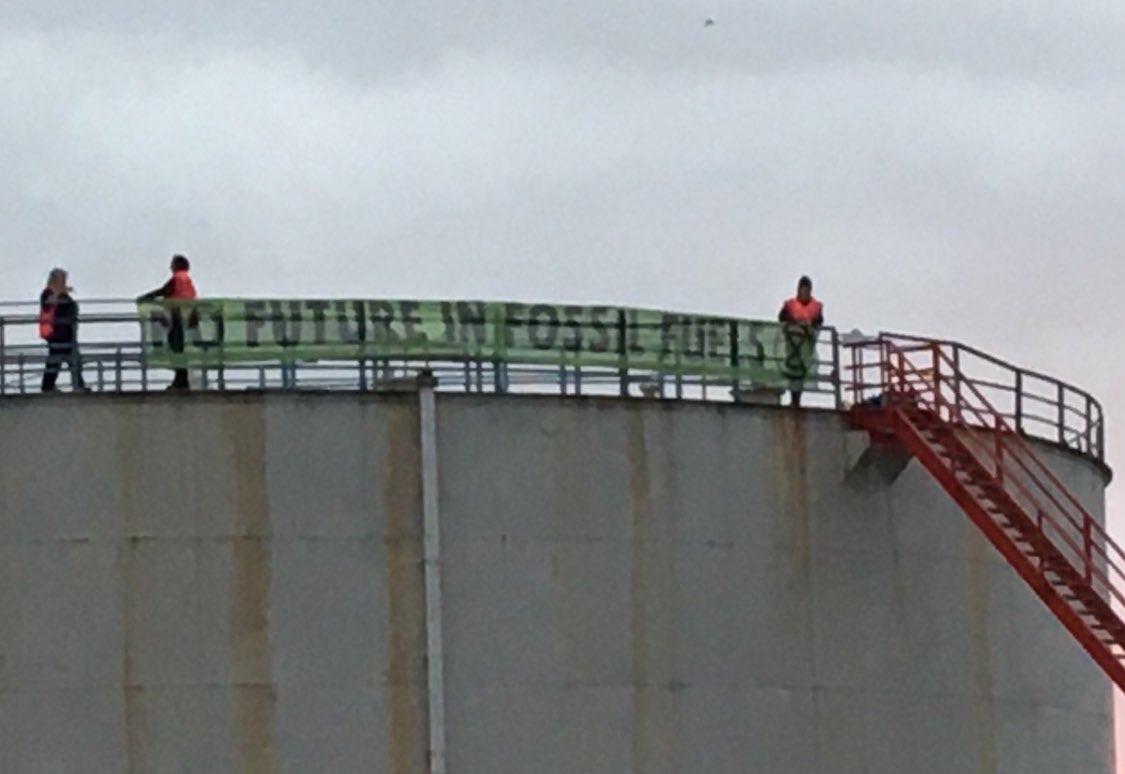 The group said protesters cut the electrified perimeter fence. Some activists have locked on to structures across the site, the group said. Others have scaled two 50ft oil tanks to unfurl banners reading Climate Emergency and No future in fossil fuels.