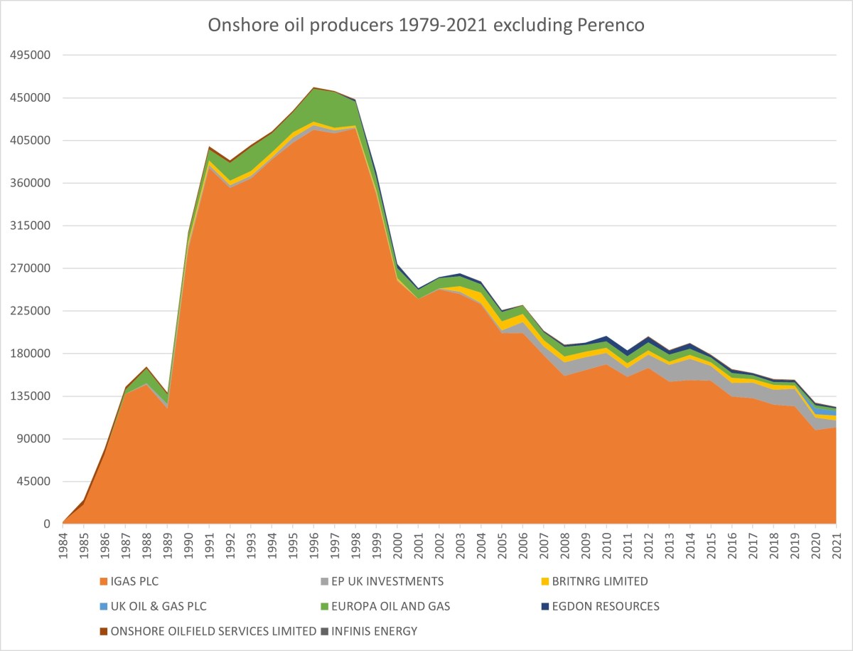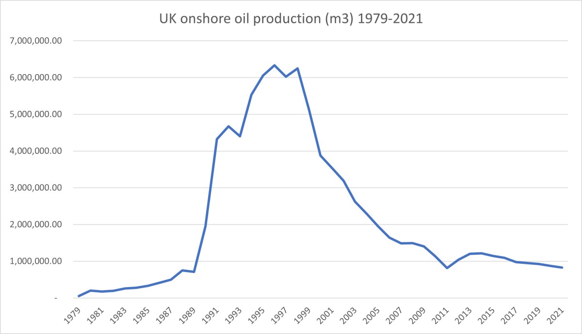 Annual UK onshore oil production has fallen again, continuing a downward trend in 2021 that began in the 1990s.