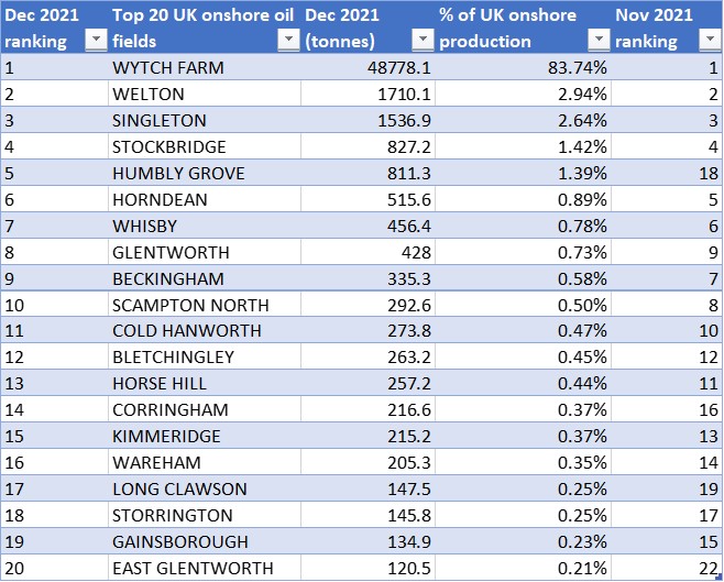 Humbly Grove in Hampshire reclaimed its place in the top five in December 2021, after calling 74% in November 2021. Horse Hill continued its fall in the rankings, down to 13th place, despite a production increase of nearly 6%.