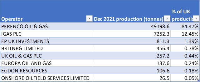Production from IGas fields was down more than 500 tonnes and its share fell more than 1.5%. EP UK Investments, which operators Humbly Grove, rose back up the rankings, increasing its weight and contribution to UK onshore totals, compared with November 2021.