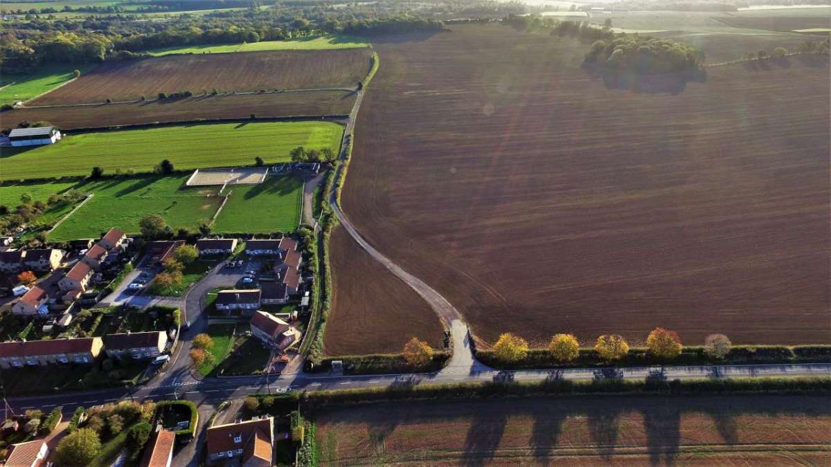 Aerial photo of the proposed Ineos shale gas site at Woodsetts (brown field on right of picture). Photo: Woodsetts Against Fracking