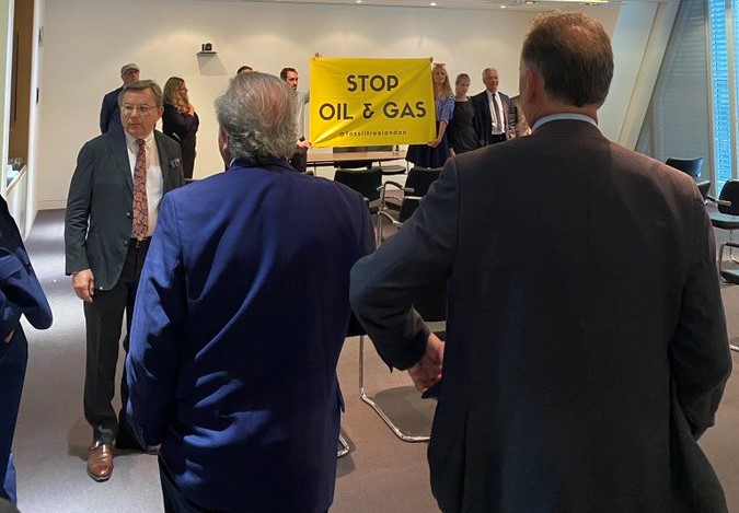 Protesters from Fossil Free London displayed banners and asked questions at the meeting of UK Oil & Gas plc (UKOG).
