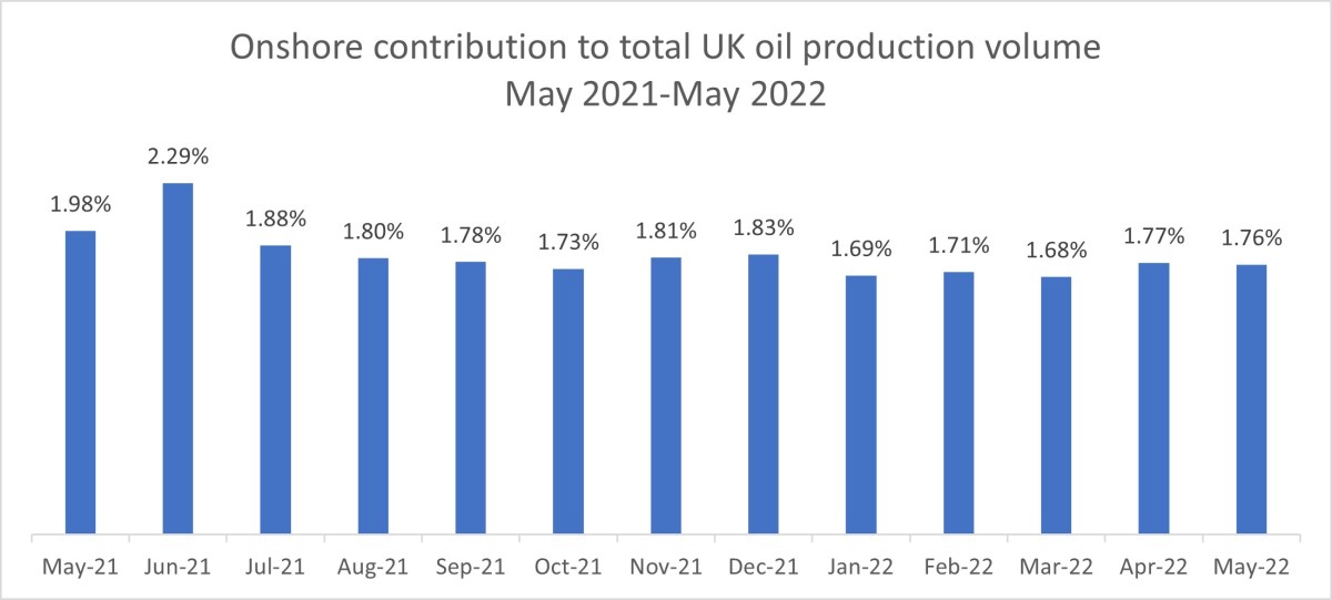 Volume of onshore as a proportion of UK total oil production: 1.76%