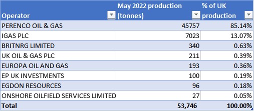 The UK’s biggest onshore oil producer, Perenco, saw its total production fall slightly in May 2022 (45,757 tonnes, down from 45,954 tonnes in April 2022). But the company saw its share of UK onshore oil production rise back above 85% for the first time since October 2021.