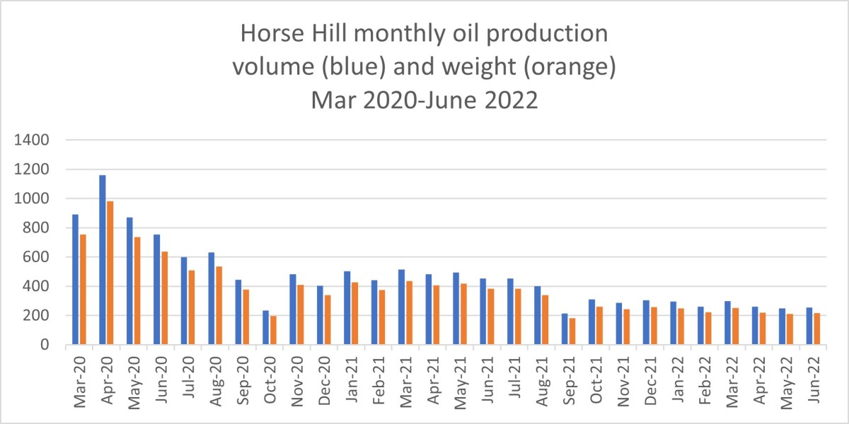Brockham, in Surrey, recorded oil production for the first month since October 2018. In June 2022, the field produced 5.66 barrels of oil per day and a total of 27m3 (22.5 tonnes). Water production was higher than oil at 53.1m3.