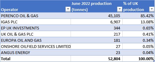 BritNRG, which has been placed third for several months, was not listed in June 2022 because there was no report of production from its site at Whisby. Egdon Resources was also not listed because there was no reported production from its fields (Dukes Wood, Fiskerton Airfield, Keddington, Kirkleatham, Kirklington and Waddock Cross).