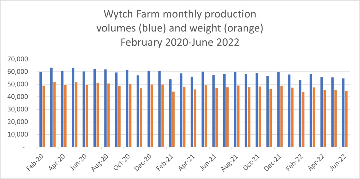 Palmers Wood, in Surrey, continued to increase production, up to 125 tonnes in May 2022, to 178 tonnes in June 2022, a rise of more than 40%. Production also rose at Wareham, in Dorset.