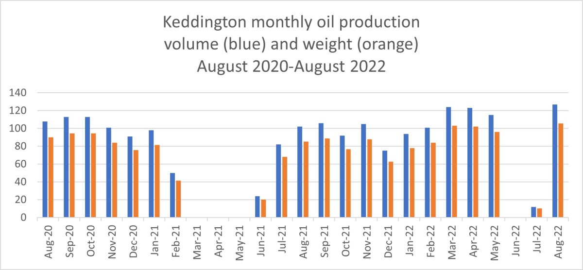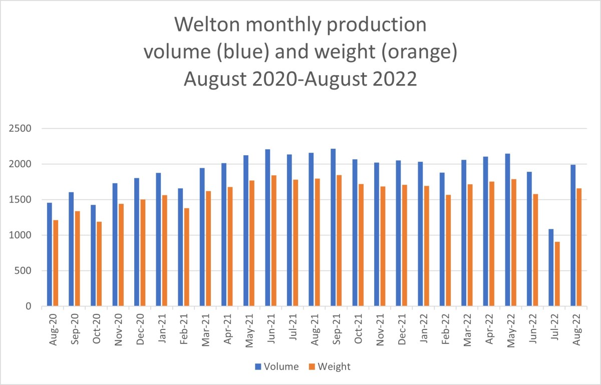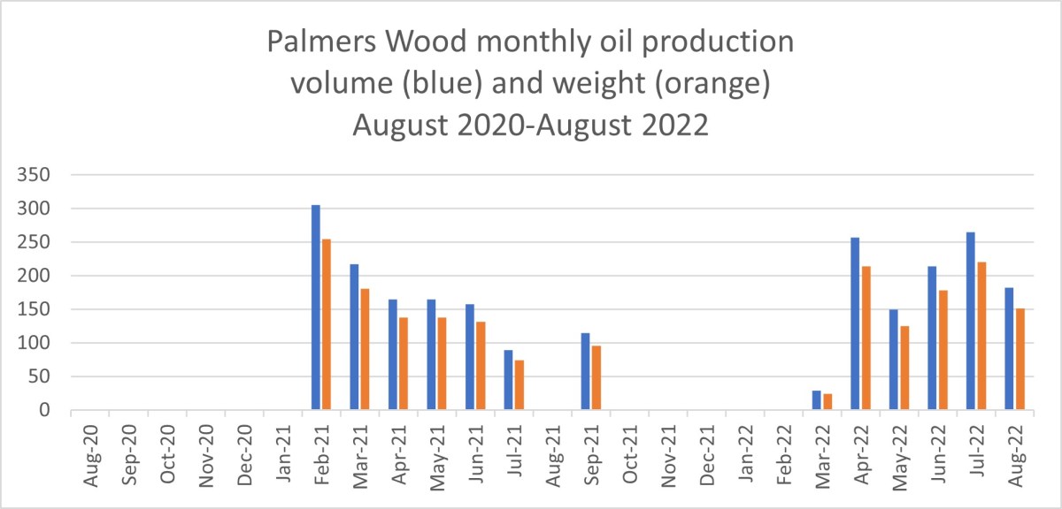 Oil volume at IGas’s Welton site near Lincoln was up 48% in August 2022 (1,992m3), compared with July 2022 (1,087m3). Daily oil production also rose, from 220bopd to 404bopd. Volume and weight were above figures for June 2022 but below the monthly figures for March-May 2022.