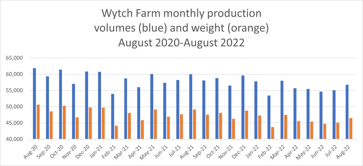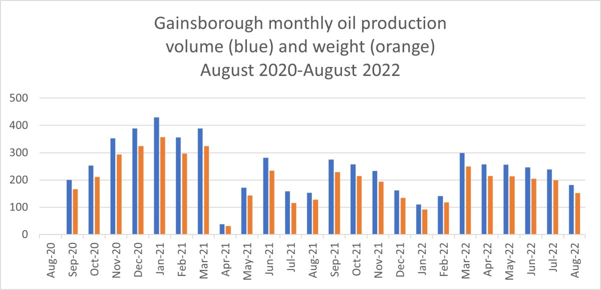 Oil volume and weight and daily production dropped at Gainsborough, another IGas field in Lincolnshire. The figures were down 24% in August 2022, compared with July 2022. August’s production was the lowest for six months.