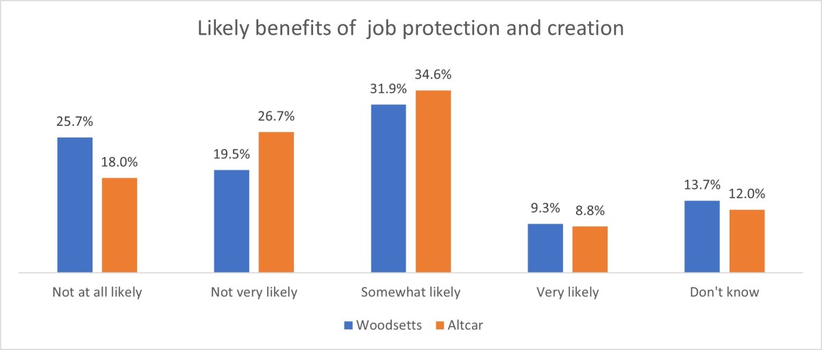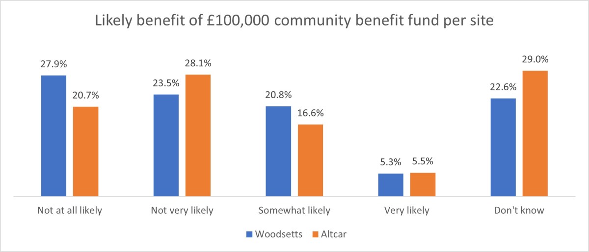 About half the people questioned thought a £100,000 community benefit package for each site was not at all, or not very likely. About 45% thought it was unlikely that the proposals would create or protect jobs.