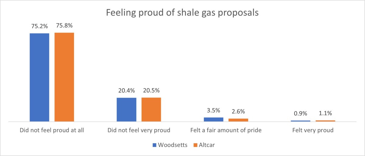 When asked about positive responses to the shale gas proposals, just over three-quarters of people in both areas said they did not feel proud at all. Just 1% said they felt very proud.