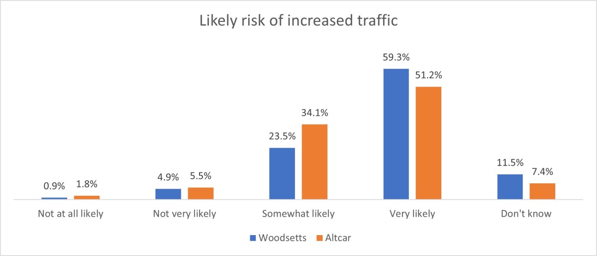 In Woodsetts, more than 82% thought increased traffic was very or somewhat likely and 72% expected the proposal would cause seismic activity .