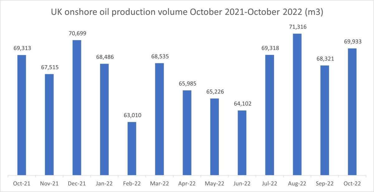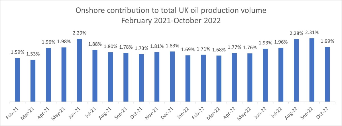 - October 2022 saw the onshore contribution to UK total oil production fall below 2%, despite the new contribution of the Wressle field in North Lincolnshire