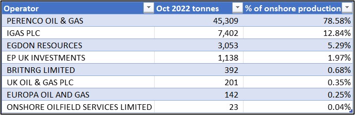 - The UK’s biggest onshore oil producer dropped two percentage points in its contribution to total onshore production (79.42% in September to 77.43% in October 2022)