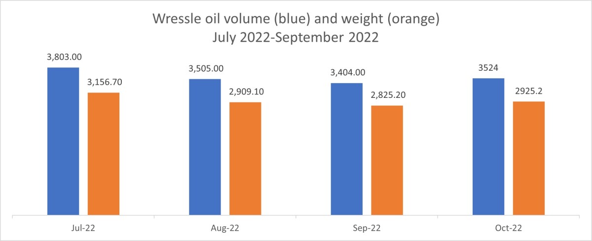 - The weight of oil produced at the field fell slightly (0.14%) from 44,706 tonnes in September to 44,642 in October 2022