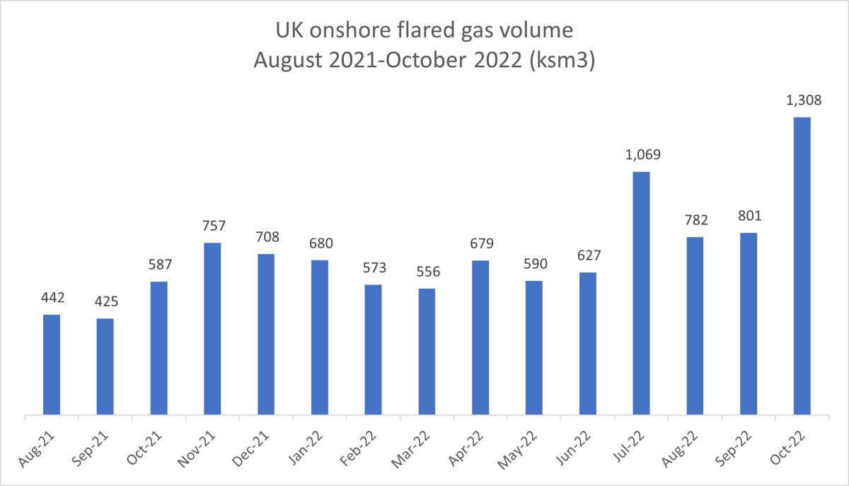 DrillOrDrop’s review of the latest UK onshore oil data for October 2022: the monthly volume of flared gas was the highest reported since records began six years ago