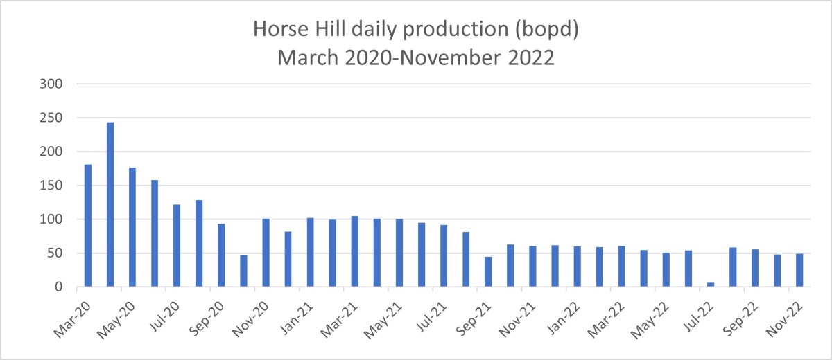 - In November 2022, it was down 79% on the peak to 49 bopd.