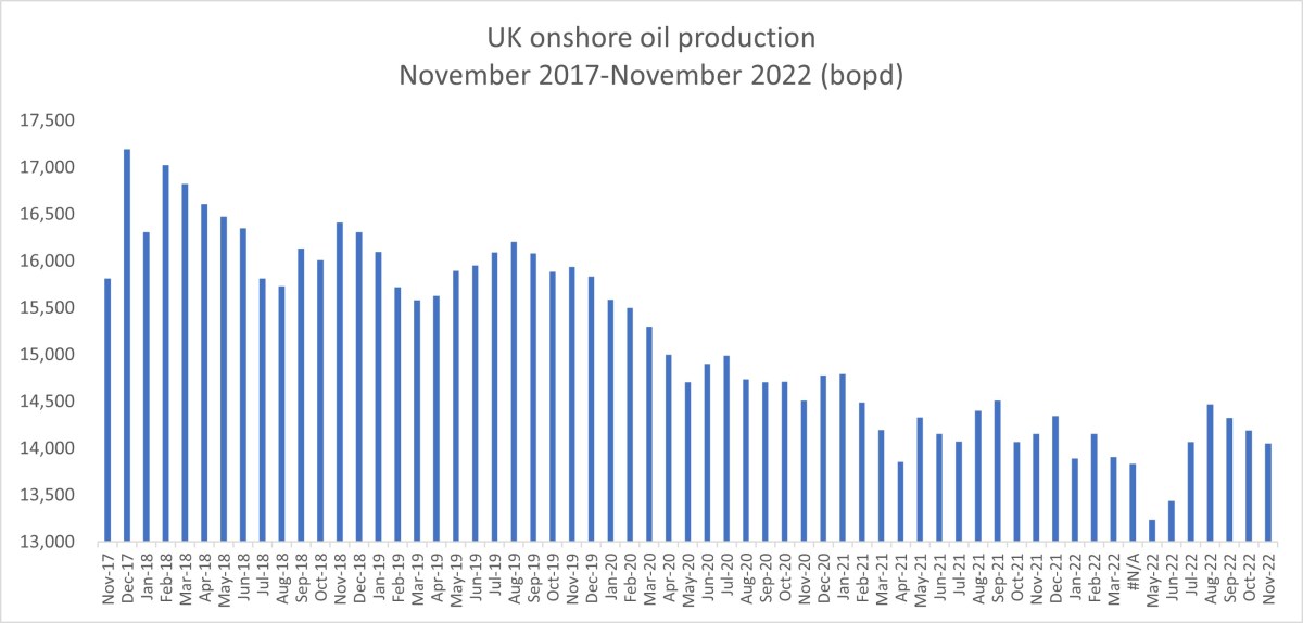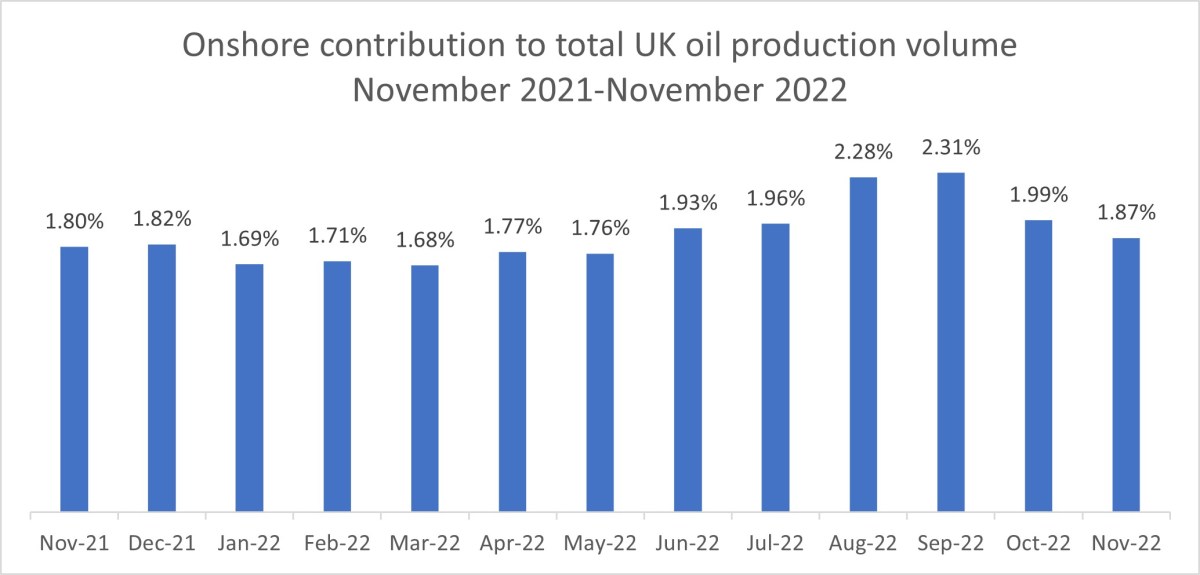 - November 2022 saw the second consecutive monthly fall in onshore contribution to total UK oil production