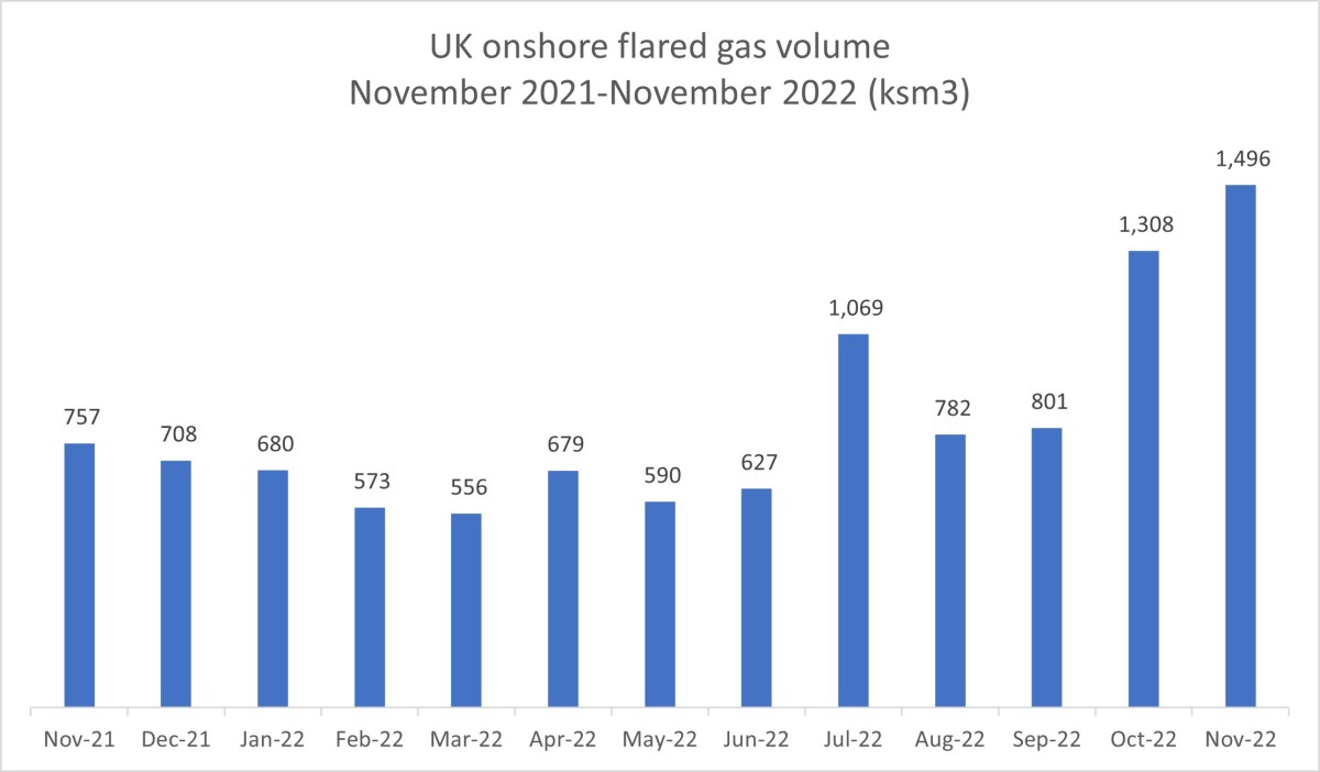 Volume of flared gas at UK onshore oilfields: 1,496 ksm3