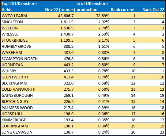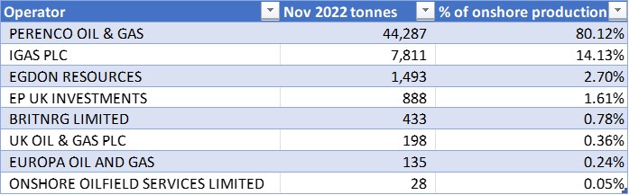 Perenco, operator of Wytch Farm, Kimmeridge and Wareham, saw production in tonnes fall about 2% between October 2022 and November 2022. But its share of UK onshore oil production rose back above 80% from 78.5% the month before.