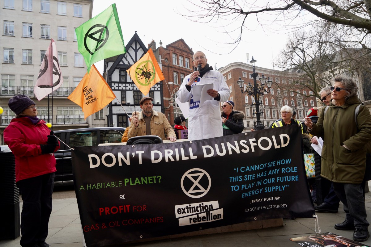 Protest at High Court by opponents of Surrey gas drilling. DrillOrDrop report on statutory review sought by Protect Dunsfold and Waverley Borough Council against gas drilling in Dunsfold.