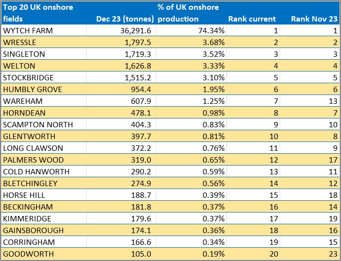 Data updates released in April 2024 changed the site at position 20 on the above table from Goodworth to Whisby and the weight of oil produced.