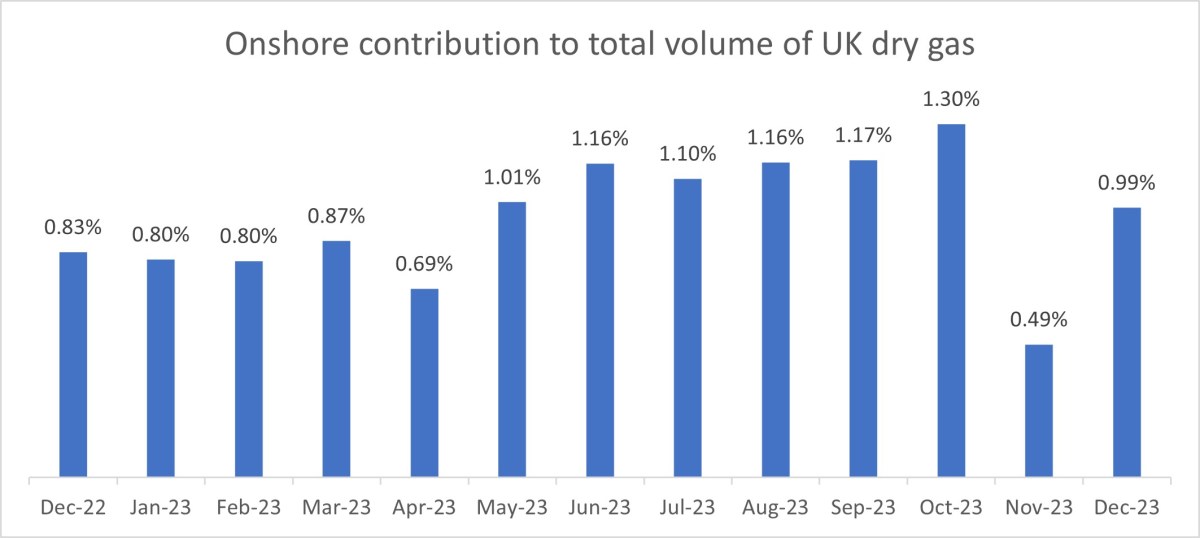 Onshore gas’s contribution to UK total production: 0.99% (November 2023: 0.49%)
