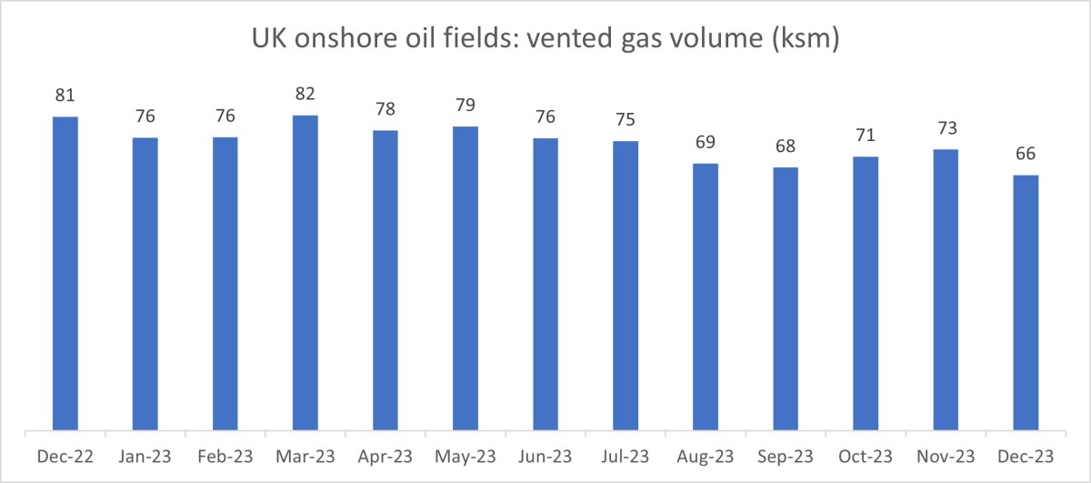 Volume of vented gas at UK onshore oilfields: 66ksm3 (November 2023: 73ksm3)