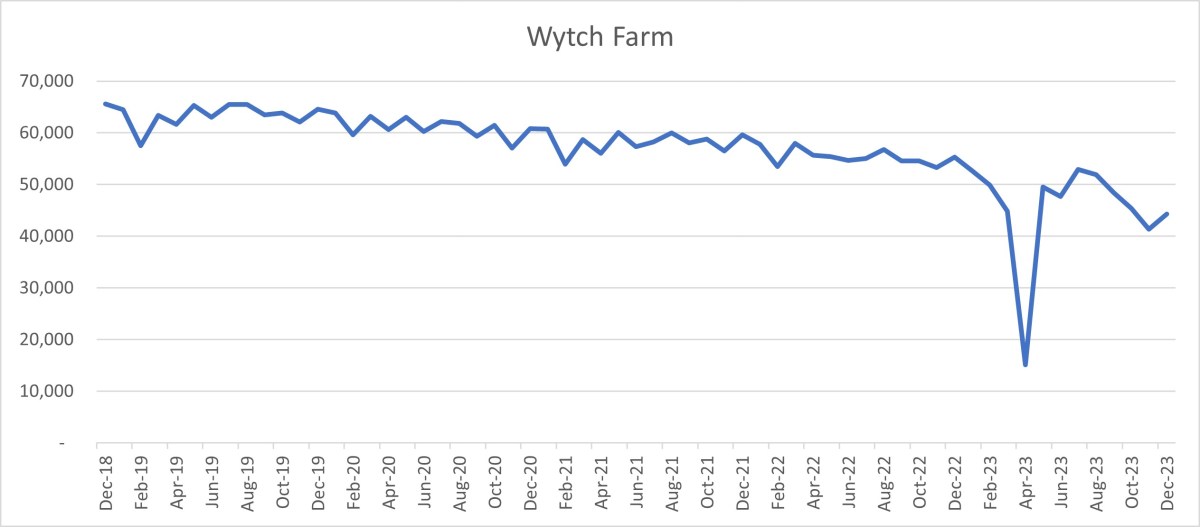 Daily oil production was up nearly 5% in December 2023, with increases at Singleton (11%) and Wytch Farm (7%).