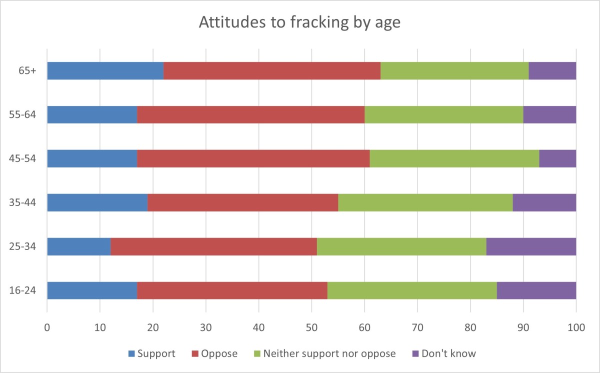 Strongest support by age for fracking was among people aged 65+ (22%). Lowest support for fracking was among 25-34 year olds (12%). Opposition was highest among 45-54 year olds (44%) and lowest among 16-24 year olds (36%).