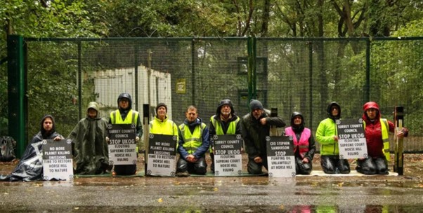 The protesters held placards which read: “Surrey County Council, stop UKOG flouting Supreme Court Horse Hill ruling”, “CEO Stephen Sanderson Stop Pumping Oil Unlawfully At Horse Hill” and “No More Planet Killing Emissions – Time To Restore Horse Hill To Nature”.