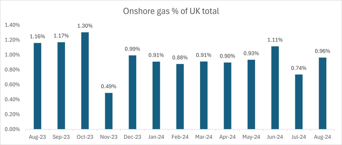 Onshore gas’s contribution to UK total production: 0.96% (July 2024: 0.74%)