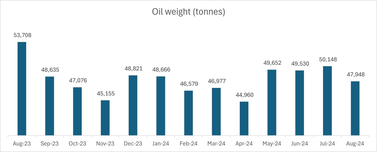 Oil weight: 47,948 tonnes (July 2024: 50,148 tonnes)