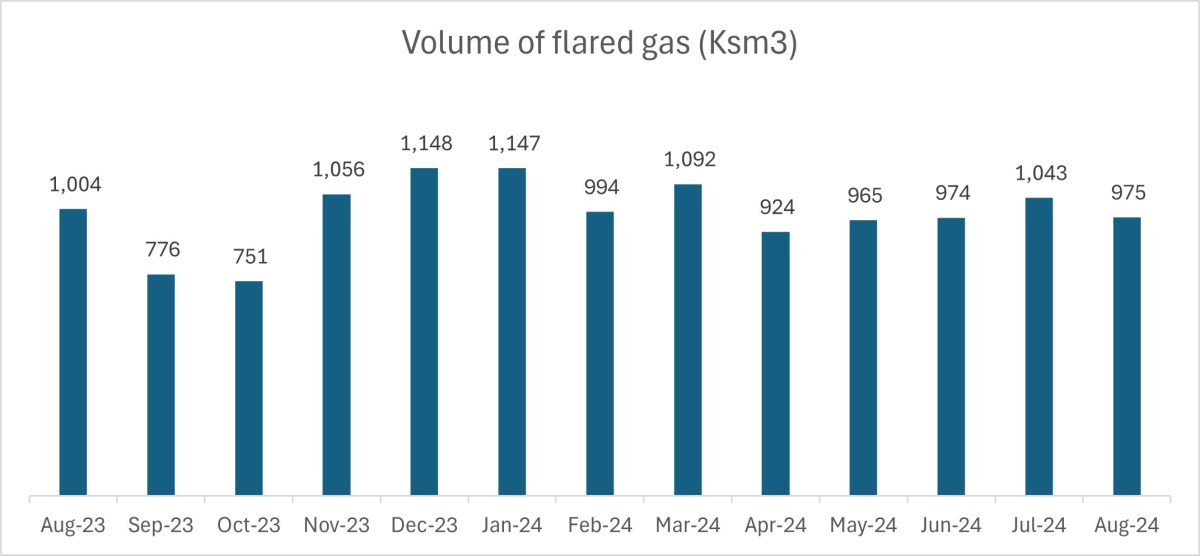 Volume of flared gas at UK onshore oilfields: 975 ksm3 (July 2024: 1,035ksm3 )