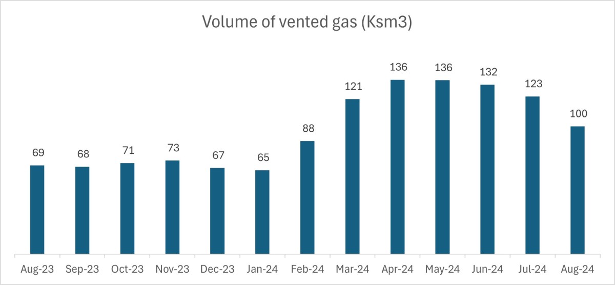Volume of vented gas at UK onshore oilfields: 100ksm3 (July 2024: 123ksm3)
