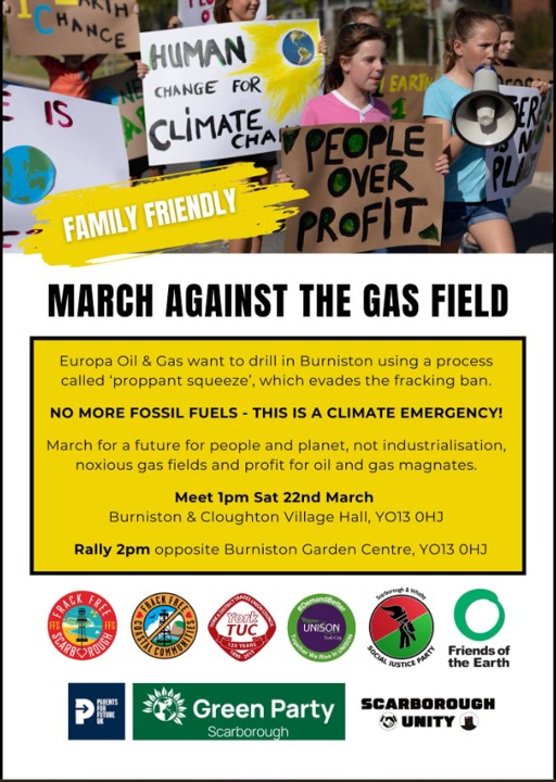 March against Burniston gas plans. 1pm meet at Burniston and Cloughton Village Hall YO13 0HU. 2pm rally opposite Burniston Garden Centre YO13 0HJ.