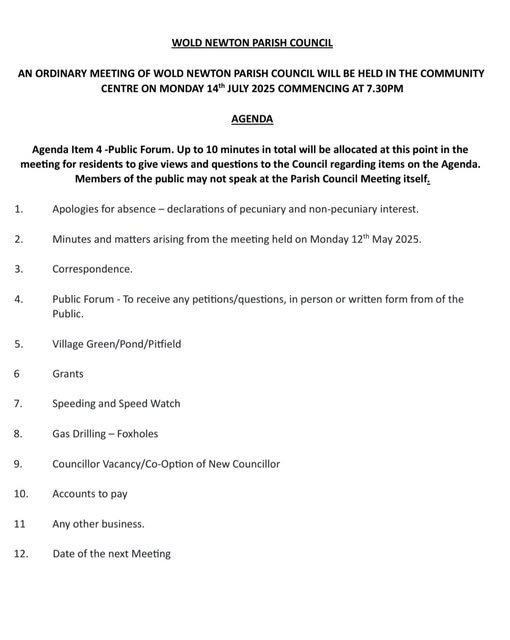 Meeting of Wold Newton Parish Council in East Yorkshire. The agenda (see below) includes proposals to drill for gas at Foxholes. 7.30pm, Wold Newton village hall, Front Street, Wold Newton.