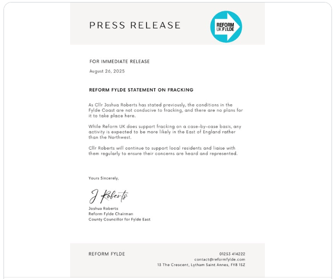 Reform-led Lancashire County Council refuses to call for a ban on fracking. A Labour motion to the council to ban fracking was amended by a Reform UK councillor to replace “fracking” with “extracting shale gas”. The amended motion also called for “”continuation of the moratorium, while commissioning a full independent review of domestic energy sources”. BBC News report