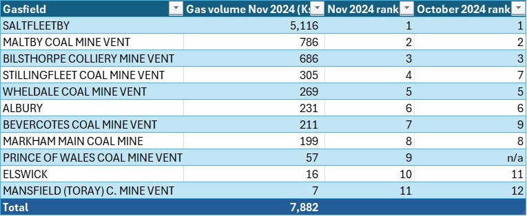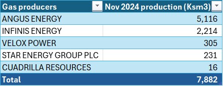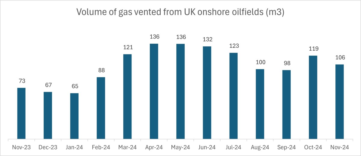 The Horse Hill operator, HHDL, reported that production had stopped in October 2024, following a ruling by the Supreme Court that the site’s planning permission had been quashed. But the NSTA data shows the company reported some oil production (65m3) for November 2024. This was about a third of the monthly average in the preceding 12 months. The site also produced and flared just under 2.5Ksm3 of associated gas in November 2024, also about a third of the monthly average of the preceding 12 months.