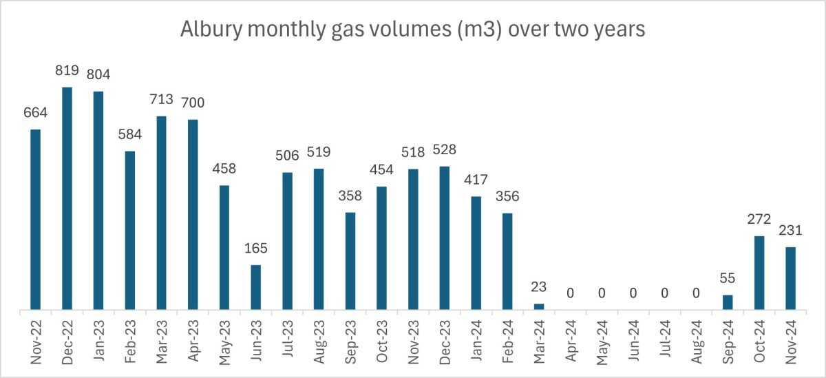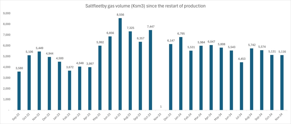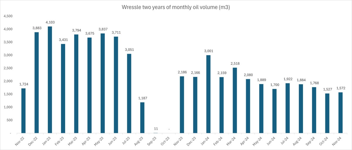 Wressle saw monthly production rise in November 2024 for the first time since July 2024. But monthly volume in November 2024 was 62% down on the peak in January 2023.