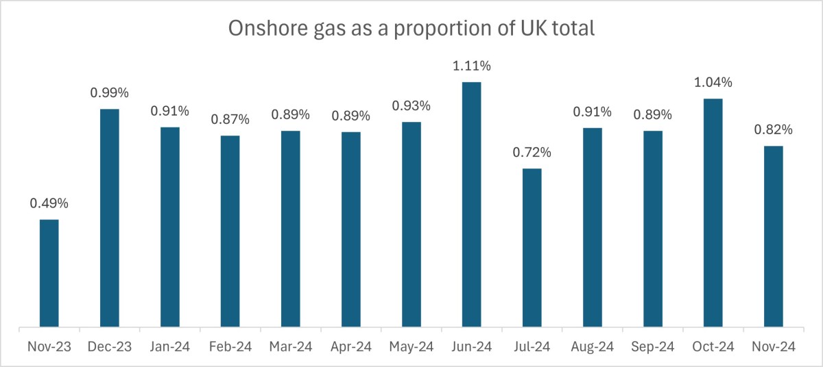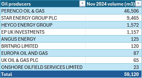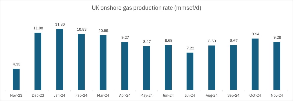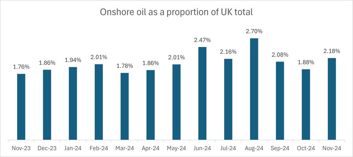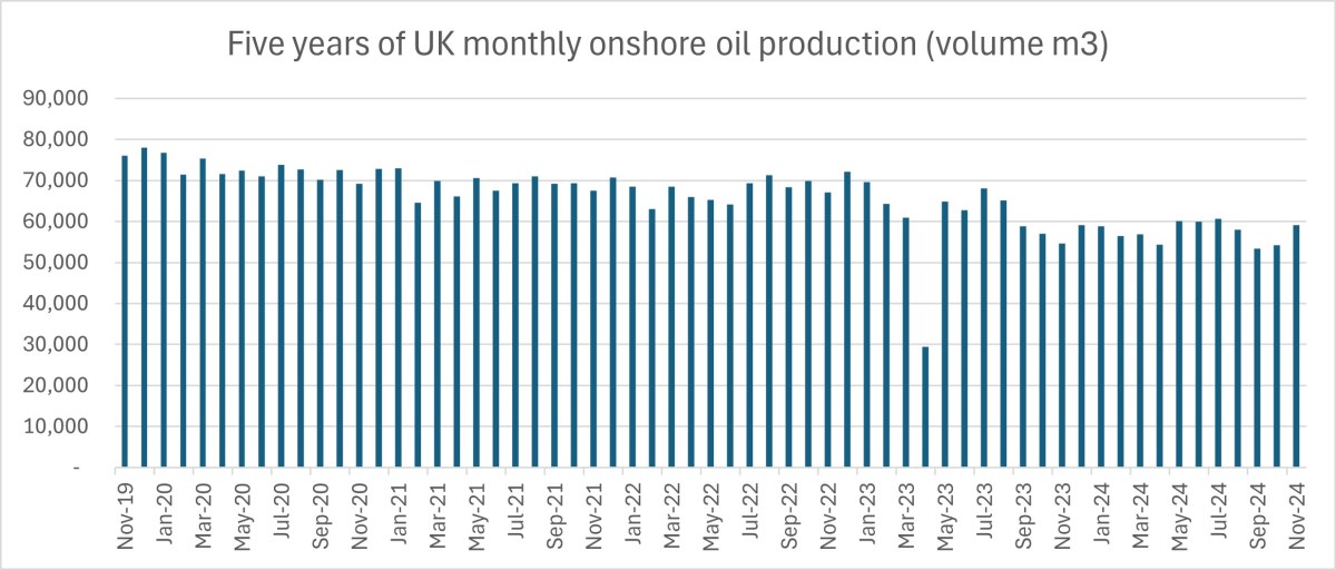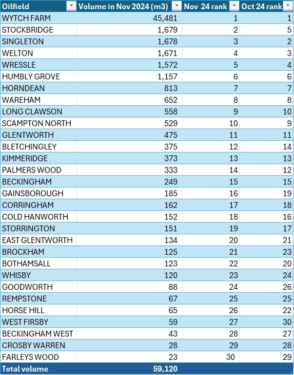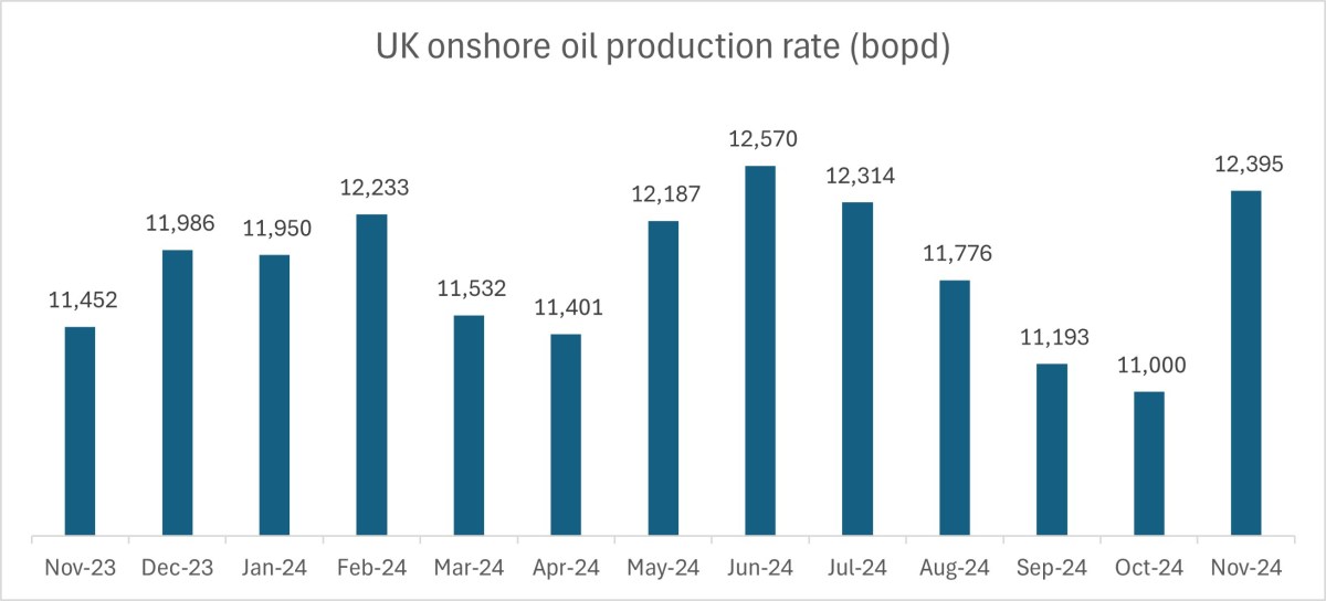 The November 2024 data shows there was no production at 13 UK onshore oilfields, the same as in October 2024.