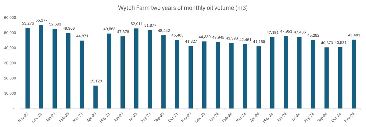 Wytch Farm’s monthly production rose 12% in November 2024, compared with October 2024. November 2024 saw the four highest production volumes in the preceding 12 months.