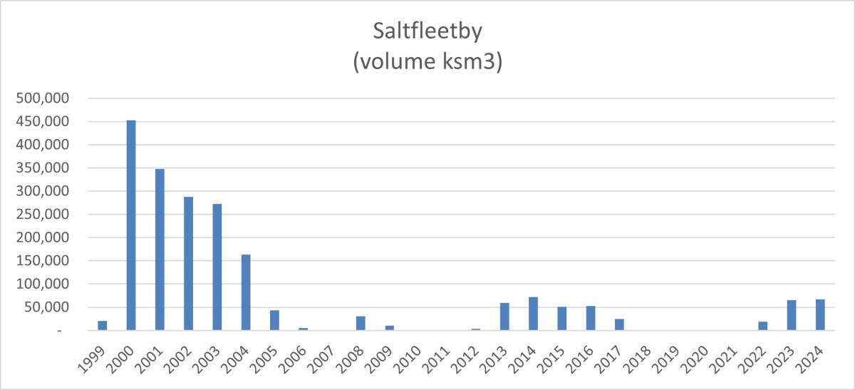 The field saw its highest output since 2014. But Saltfleetby’s 2024 total volume (66,980ksm3) was below the average (78,770ksm3) for the past 26 years in which it produced gas. The total was also a long way short of the peak year for production (452,812ksm3 in 2000).