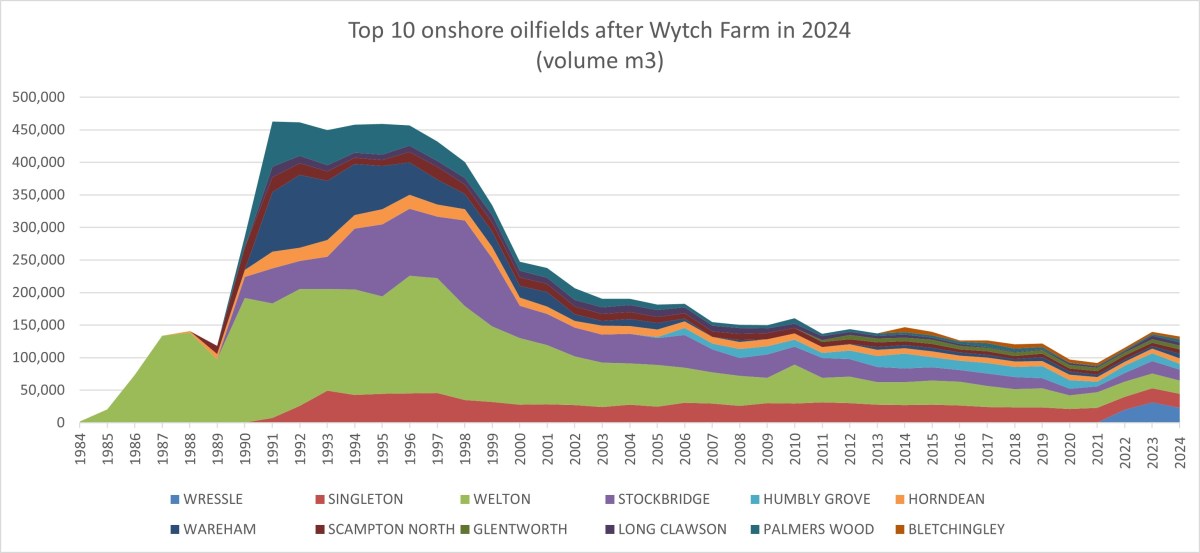 After Wytch Farm, the next nine highest-ranking UK onshore oilfields produced 118,464m3, 17% of the onshore total. This volume was slightly lower than in 2023 but higher than in 2022.