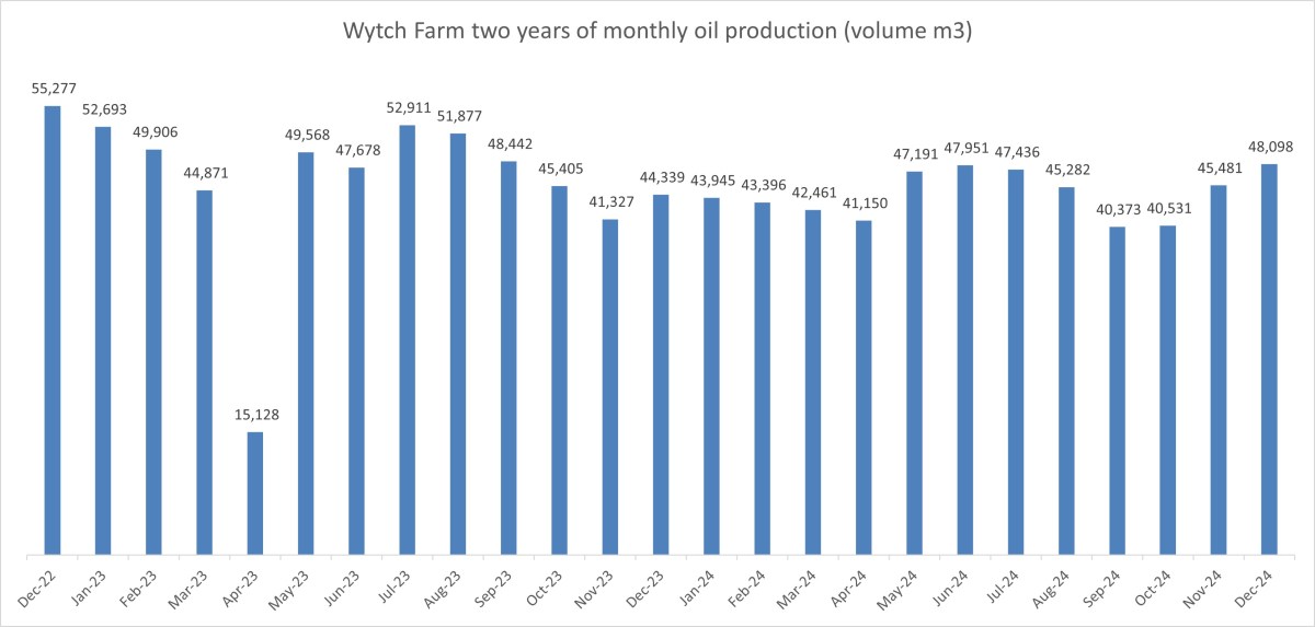 The volume of UK onshore oil produced in December 2024 was up 5% , compared with the month before, almost topping the record for the year.