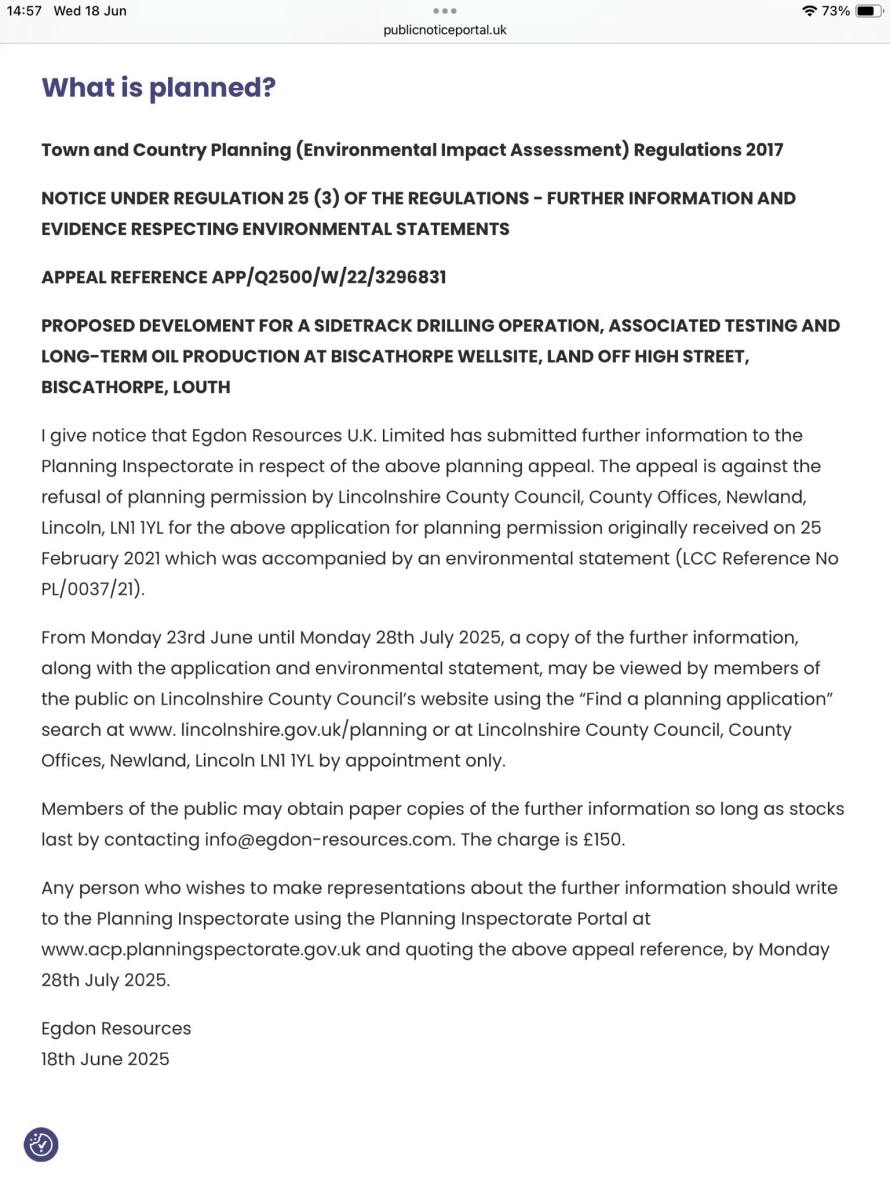 The consultation is the latest stage in a 10+ year campaign against oil operations at Biscathorpe. The site, where no oil has yet been discovered, is in the Wolds National Landscape (formerly known as an area of outstanding natural beauty).