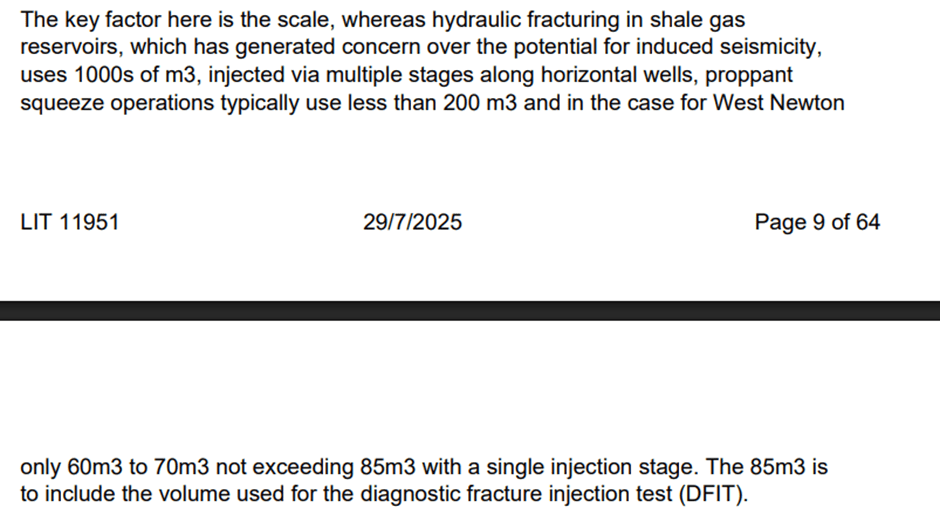 “The proposed activities are at the lowest end of the pressure spectrum associated with conventional hydraulic fracturing and are therefore unlikely to induce any seismic movements in the area.”