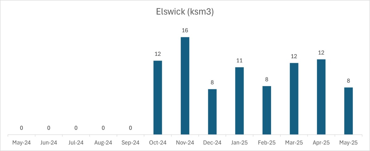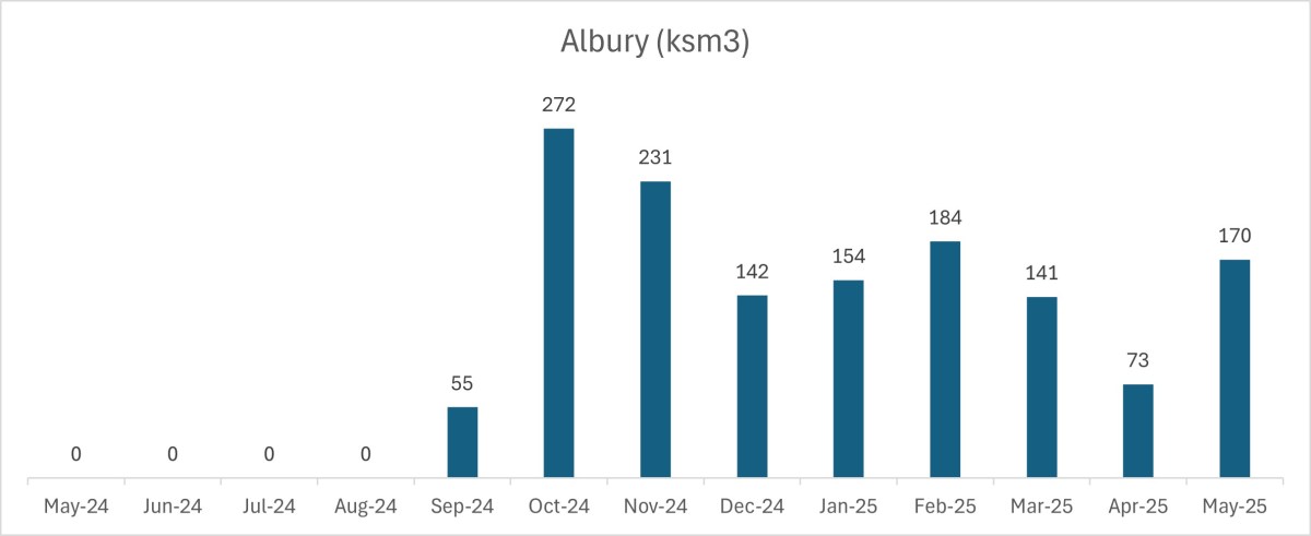 April 2025 571ksm3, March 2025 899ksm3, February 2025 848ksm3, January 2025 940ksm3, December 2024 880ksm3, November 2024 1,067m3, October 2024 951 ksm3, September 2024 943 ksm3, August 2024 975 ksm3, July 2024 1,035ksm3