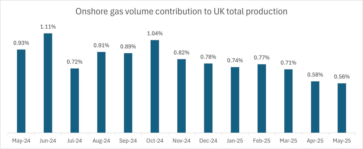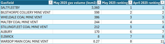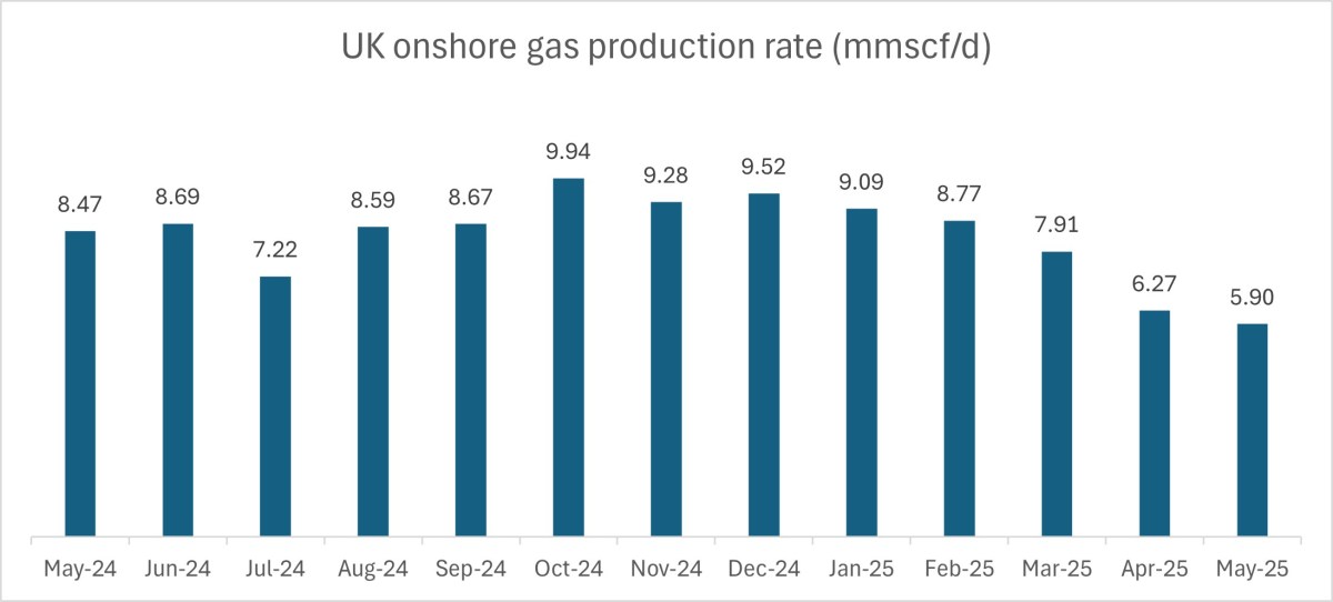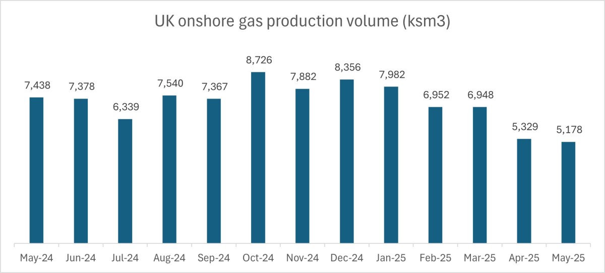 UK onshore gas production fell again in May 2025, for the fifth consecutive month. The May figure was the lowest for 18 months, despite a small increase in production from the largest field at Saltfleetby.