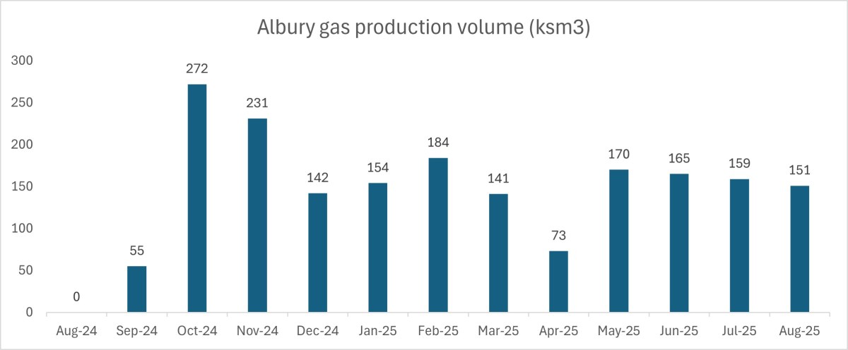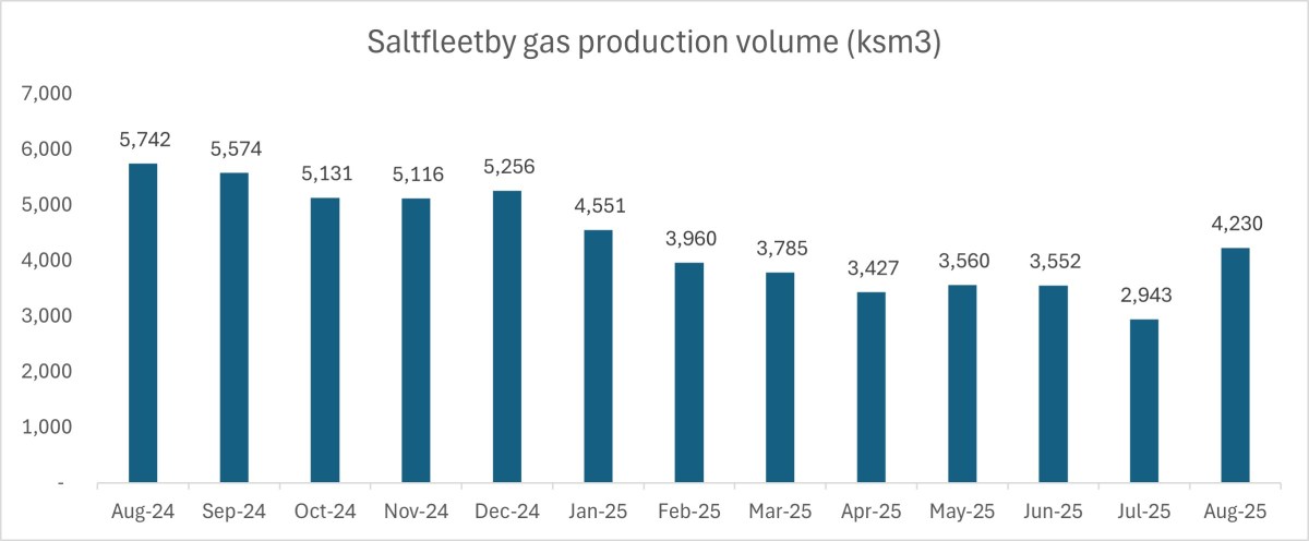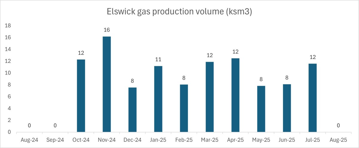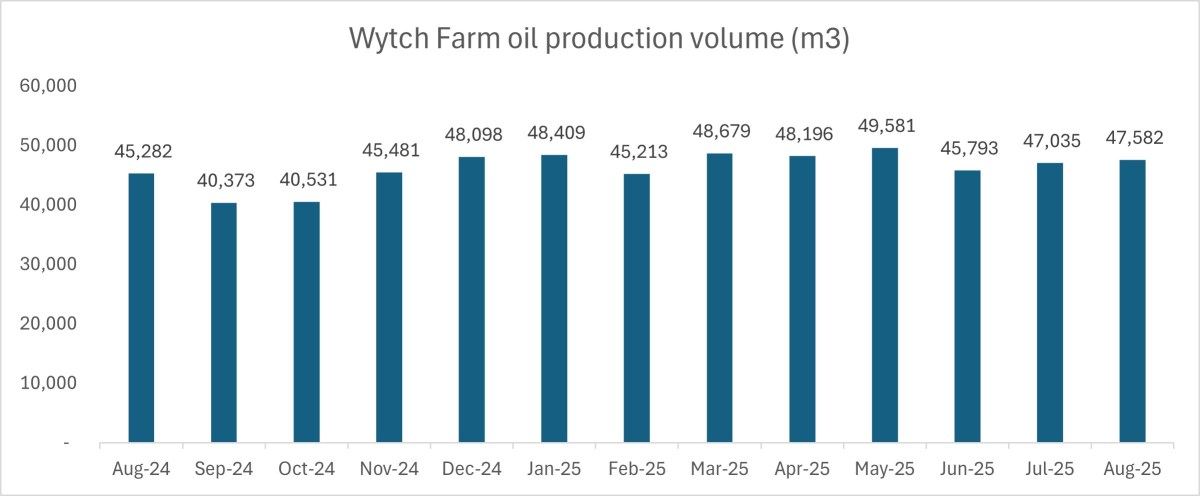 Production at the two largest onshore producing fields both rose: Wytch Farm oil by 1% and Saltfleetby gas by 44% compared with July 2025. No gas production was reported at Elswick in August 2025 after 10 months of resumed extraction.